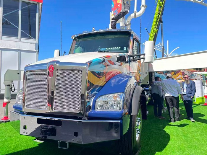 △ Zoomlion's concrete pump truck with an "American comics" paint scheme and a chassis specially designed for North America